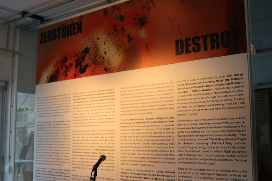 In diese Kategorie von Zer/Störung gehören Adelheid (maschen - Korinna Lindinger und Julia Rosenberger) und One Step Revolution (Mz* Baltazar’s Laboratory - Stefanie Wuschitz). Ausdrucksfreiheit, Zerstörung des Korsetts von Genderrollen, Vereinfachung von politischen Bündnissen stehen in ihren Arbeiten im Zentrum. In dieser Weise kann auch die Rauminszenierung Säulen interpretiert werden.